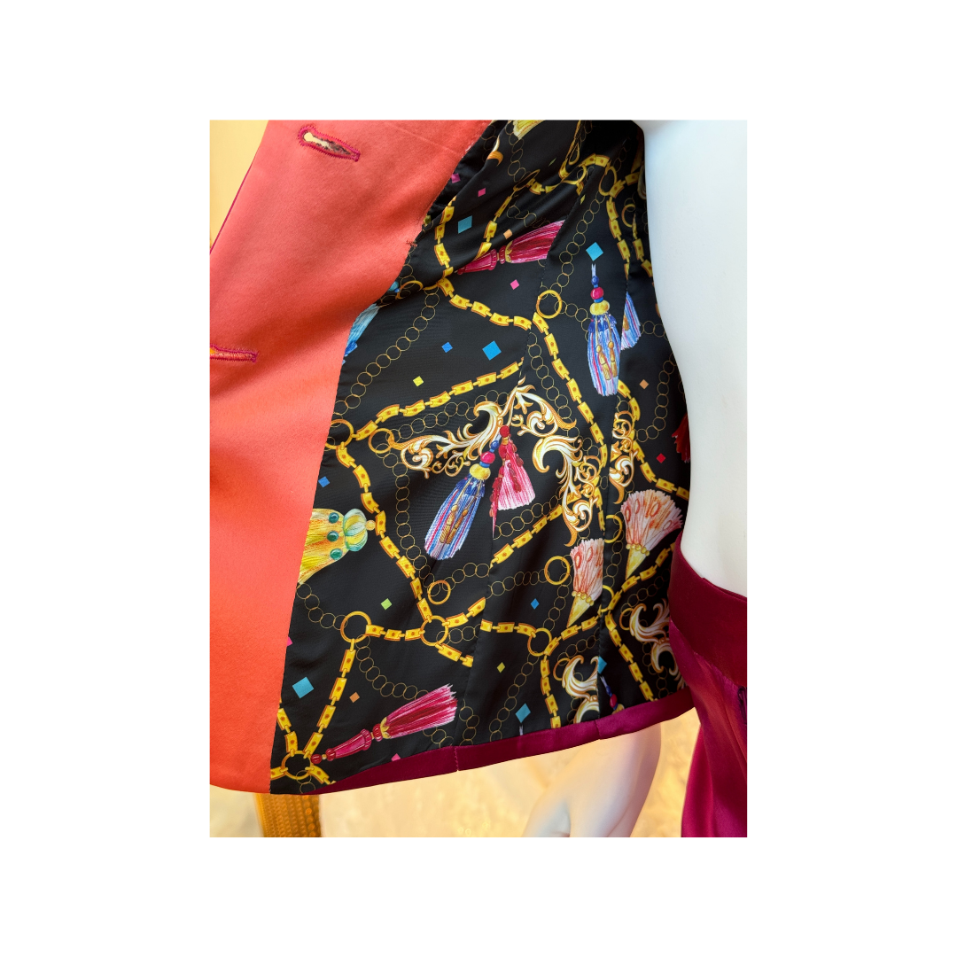 Fuchsia satin 2 piece pantsuit with orange lapel, black patterned lining