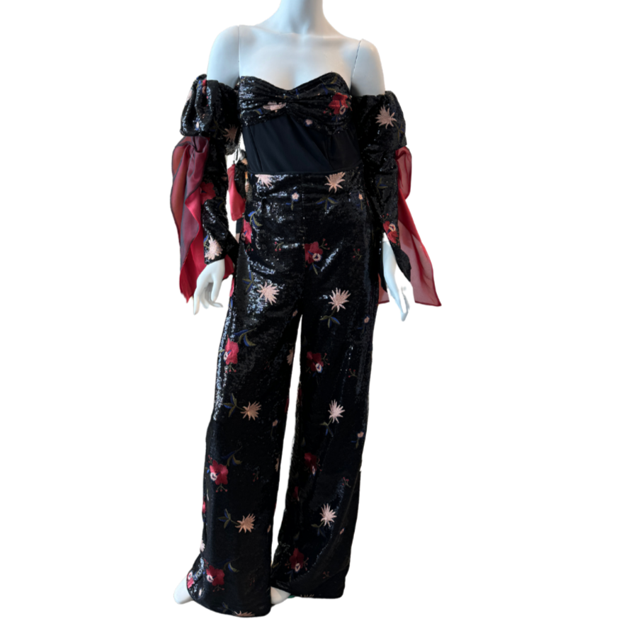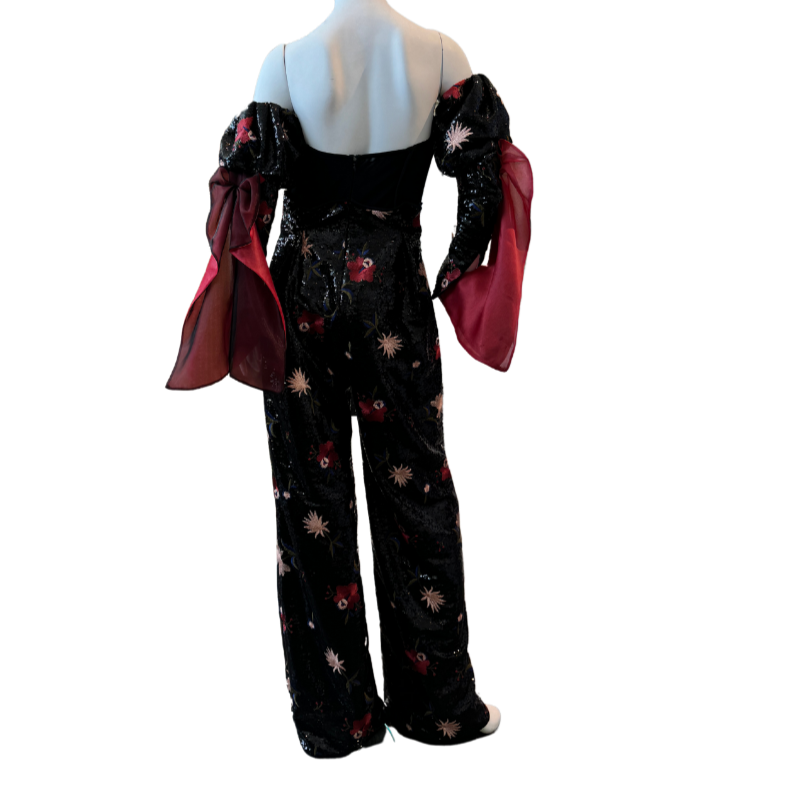 Black sequin strapless jumpsuit with embroidered floral pattern. Long sleeves with soft burgundy red satin accents. Black mesh connects the sequin sweetheart boned bodice to the high-waisted, wide legged pants with pockets