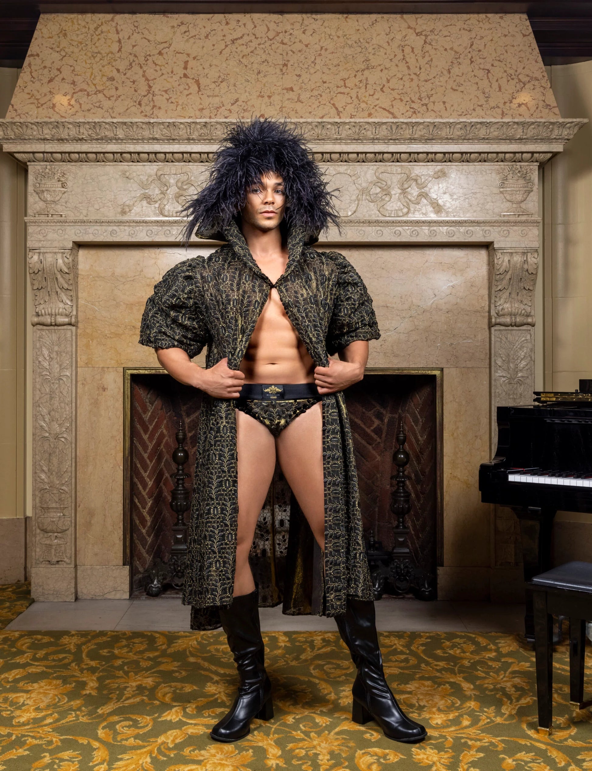 Stunning black patterned fabric with golden edged embroidery, this full length cape is sure to be showstopper with a stylish wide collar, ties at neck and waist, this piece is meant to be seen. Iridescent gold lining and dramatic long poof sleeves adds a beautiful accent to this truly gorgeous cape.