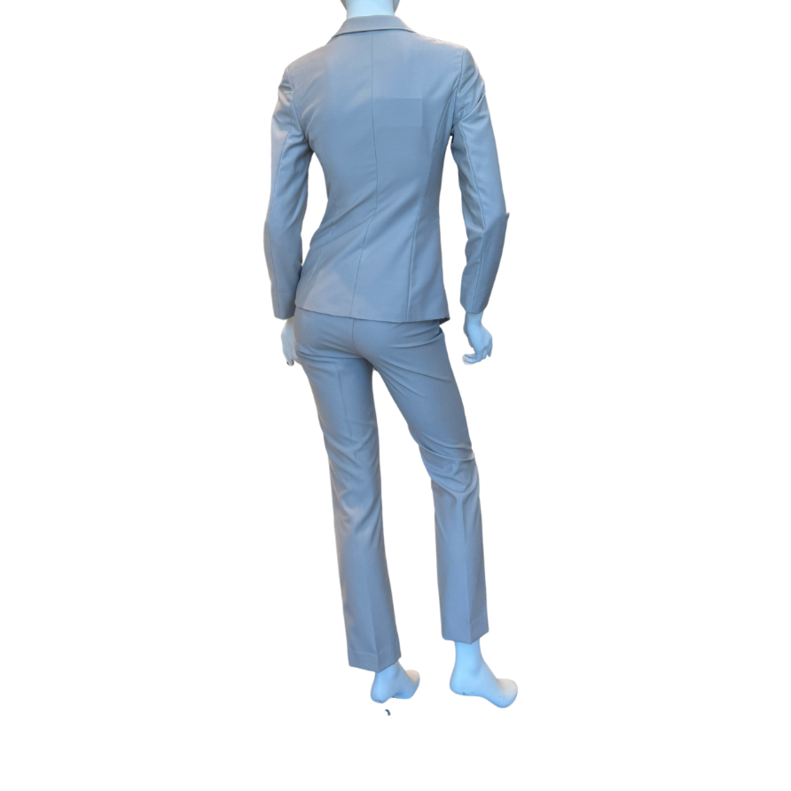Light grey 2-piece suit featuring an asymmetrical suit coat with pink satin lining. Straight leg pants to ankle length