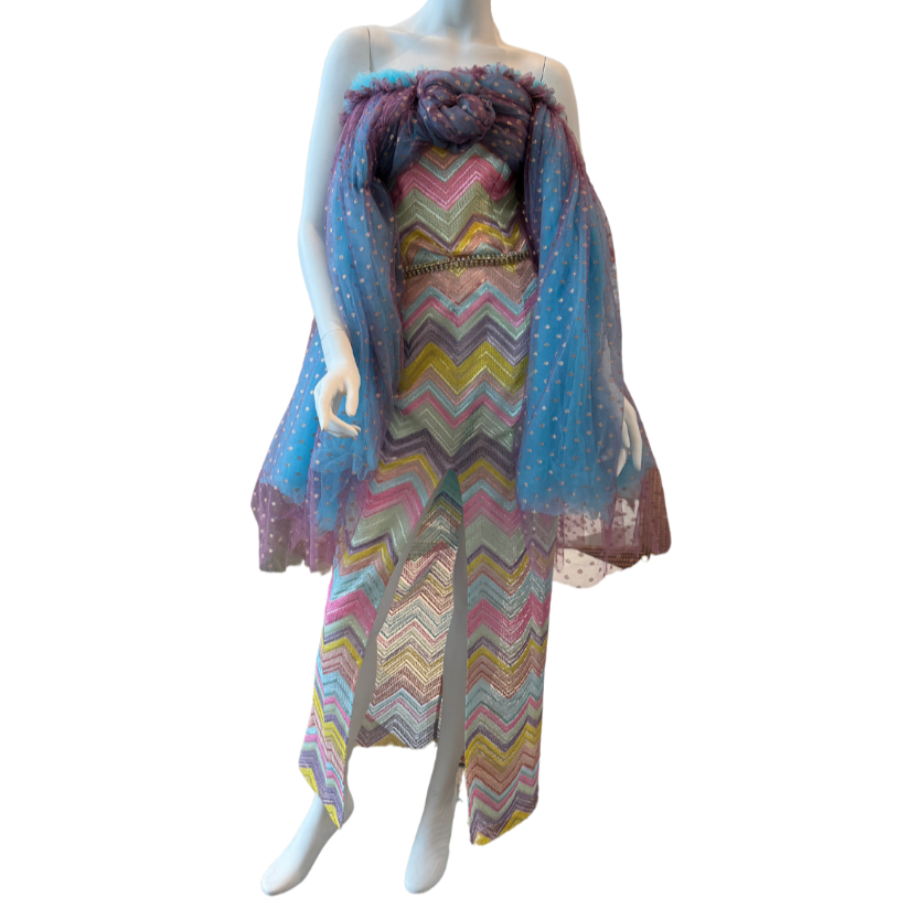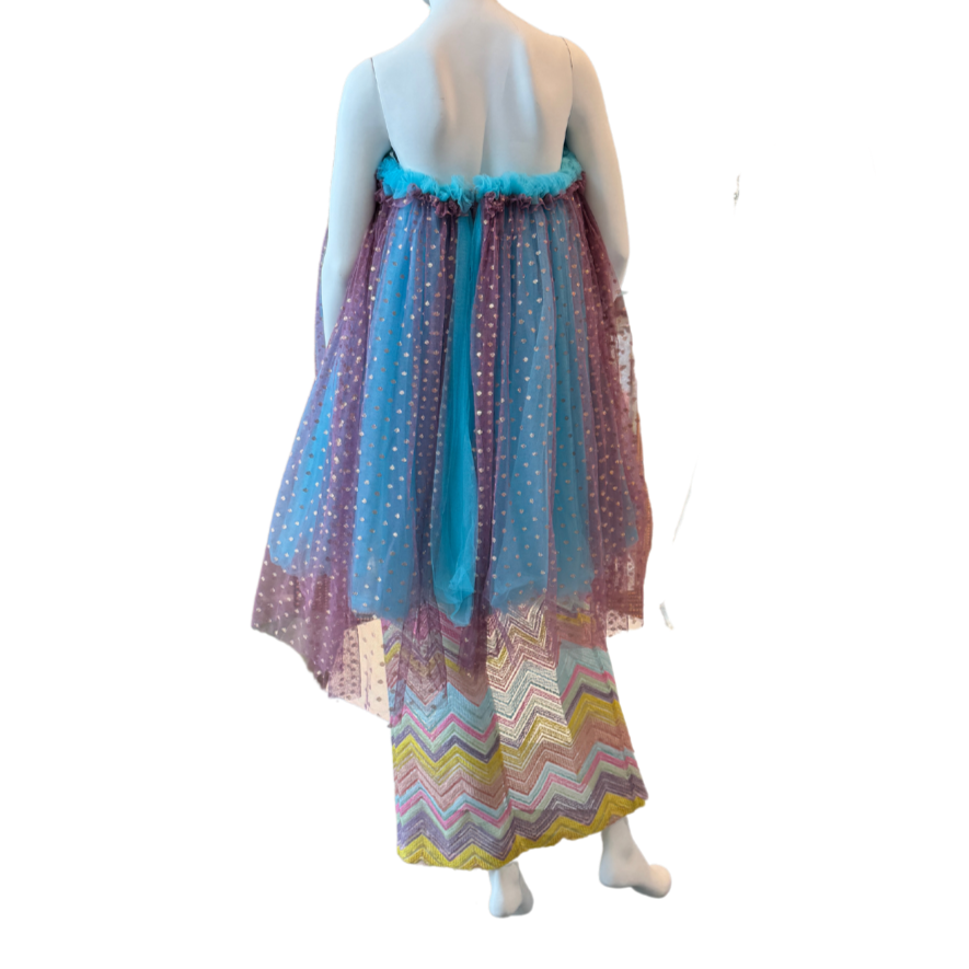 Strapless sheath dress in colorful chevron fabric with dramatic tulle accents along the neckline in pastel blue and lavender with gold sparkle polka dots. Sheer on the bottom skirt, while the bodice is solid for no show-though. Waist is accented by a band of beautiful gemstones, coupled with a front slit makes this piece truly unique