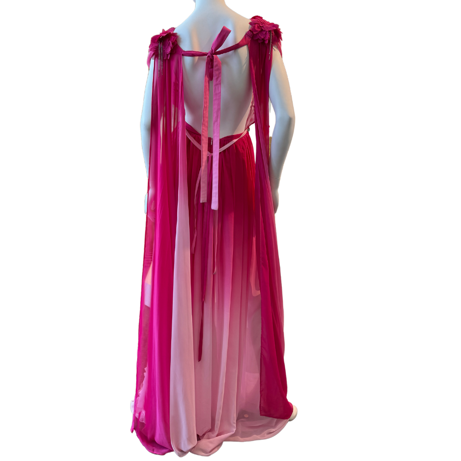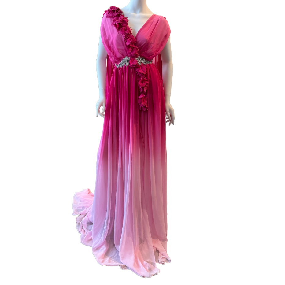 Romance is in the air with this beautifully sheer pink ombre dress with flower appliqués streaming from one shoulder down past the crystal embedded waist for a dramatic effect. Low back features ties at shoulders with draped fabric that meets the train in back for a dress that is sure to capture the admiration of anyone with an eye beauty