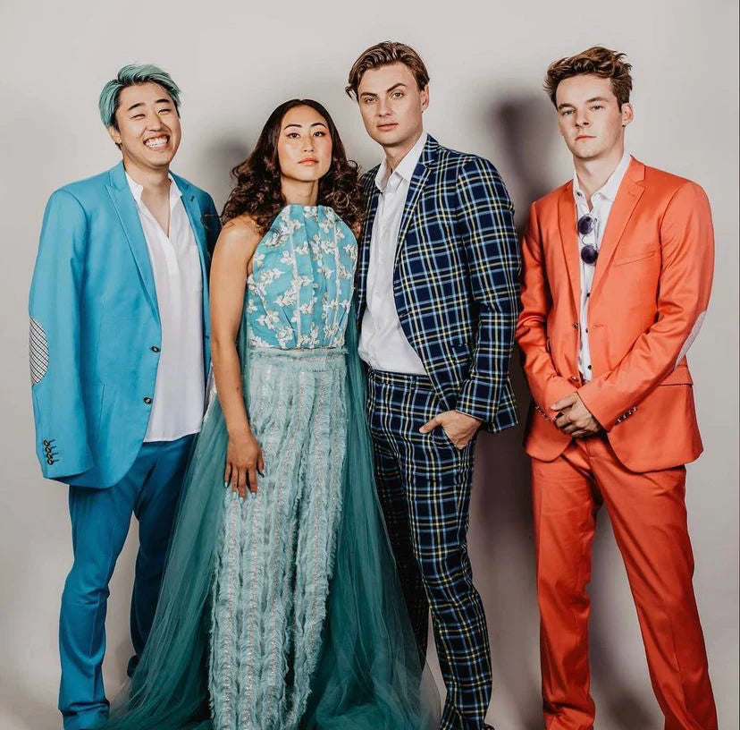 This one of a kind two piece is a showstopper from the sequin floral strapless high neckline top with gathered tulle on the back that drapes down to a long dramatic train, to the sequin and fringe striped wide-legged pants.