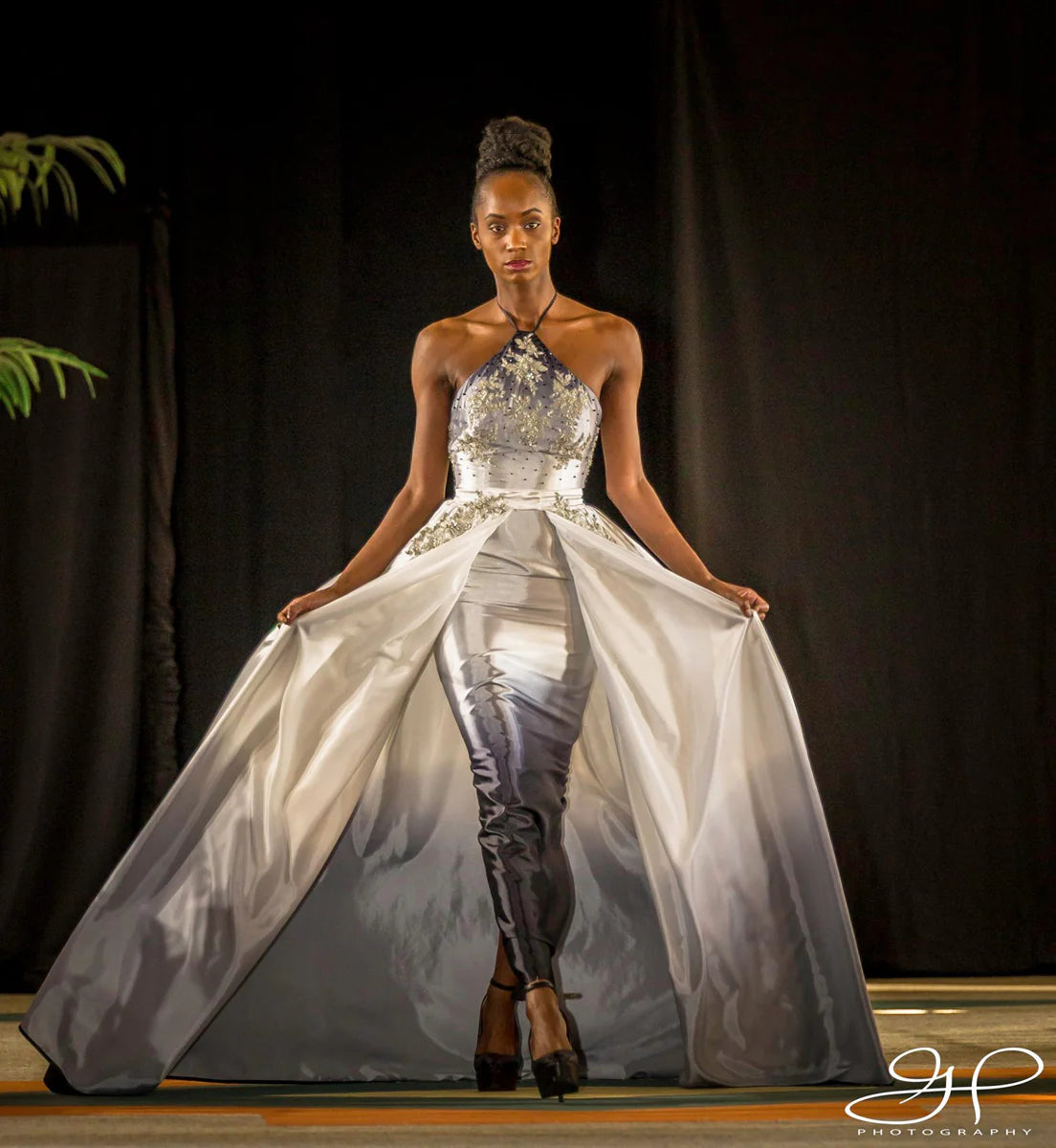 Haltered shift dress with added skirt in satin white to black ombre completely transforms this truly unique original piece. Details include: hand sewn beading and appliqué across the chest and waistline, back slit in the skirt, generous tie at the back of neck that drapes beautifully, removable gathered skirt with gentle train