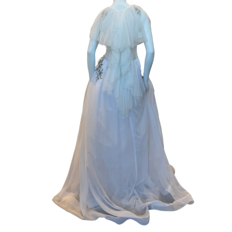 Sheer white ballgown with soft dotted ruffles frames the v-neckline that transforms into romantic fabric cascading down the high back. Bejeweled with beads and sequin lace appliqués are beautifully hand sewn on bodice and waistline